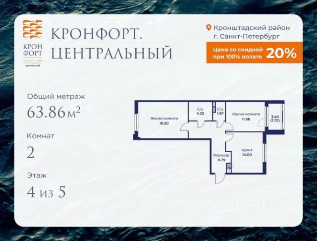 Стоимость квартиры указана со скидкой 20%. Скидка предоставляется при 100% оплате или несубсидированной ипотеке. Предлагается квартира площадью 46.76 кв.м в жилом комплексе "Кронфорт. Центральный" в Санкт-Петербурге (Кронштадт). Возможна покупка с использованием льготных и специальных ипотечных программ с государственной поддержкой. Высота потолков в квартирах — от 3 до 3,4 метров, окна увеличенного размера, есть варианты с эркерами, французскими балконами, лоджиями и террасами. Жилой квартал состоит из пяти четырехэтажных корпусов с закрытыми охраняемыми дворами, свободными от машин. Первые этажи формируют торговые променады в стиле пешеходных улиц исторической части Петербурга и Кронштадта. Внутренние пространства между корпусами — пешеходные зоны с уютными площадями. Архитектурный облик квартала разработан бюро "Проектная культура" и международной компанией Chapman Taylor. Инфраструктура комплекса включает: - Лицей с двумя бассейнами - Детский сад на 150 мест с бассейном и закрытой территорией - Веревочный парк - Игровые площадки для активного отдыха; - Кабинет врача общей практики. - Подземные паркинги с лифтами. - Мусоросборные камеры, индивидуальные кладовые. - Закрытые дворы с контролем доступа и видеонаблюдением. - Мультформатный стрит-ретейл с кафе и ресторанами. - Триатлон-центр и беговые/велодорожки. - Учебно-тренировочный комплекс для детей "Лагерь настоящих героев". Транспортная доступность обеспечивает удобный выезд на КАД (около 1-3 км), 2 минуты пешком до автобусной остановки "Лицей", 25 минут до Сестрорецка, 30 минут до "Лахта-центра", 50 минут до аэропорта "Пулково" и 60 минут до Московского вокзала. Для любителей моря доступен маршрут на "Метеоре" до центра Санкт-Петербурга. Отделка квартир предлагается как с готовой чистовой отделкой, так и со свободной планировкой без отделки для реализации индивидуальных дизайнерских решений. В третьем корпусе, продажи которого стартовали в марте 2025 года, доступны квартиры с просторными террасами, тремя балконами, кухнями-гостиными до 38 кв.м с окнами на две стороны, обеспечивающими панорамное освещение и виды. Если вам нужна помощь с оформлением ипотеки или дополнительная информация по комплексу и условиям покупки, обращайтесь в отдел продаж за консультацией. 2-комнатная квартира первичка в районе Кронштадтский в Санкт-Петербурге.