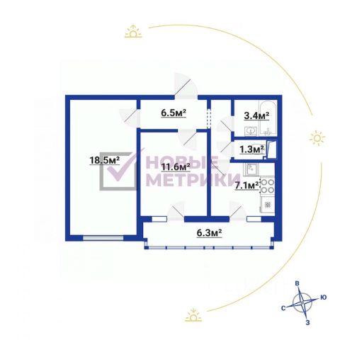 • Планировка Евро-3: просторная кухня-гостиная 20 м² + 2 изолированные комнаты (14 м² и 16 м²)