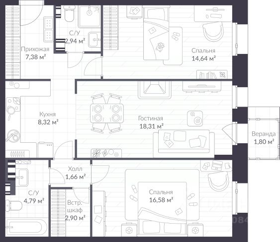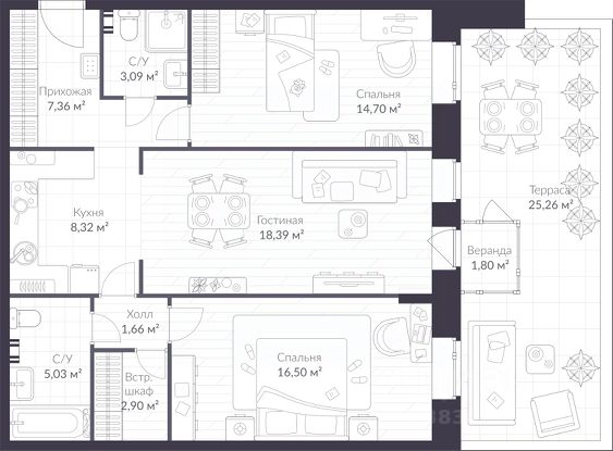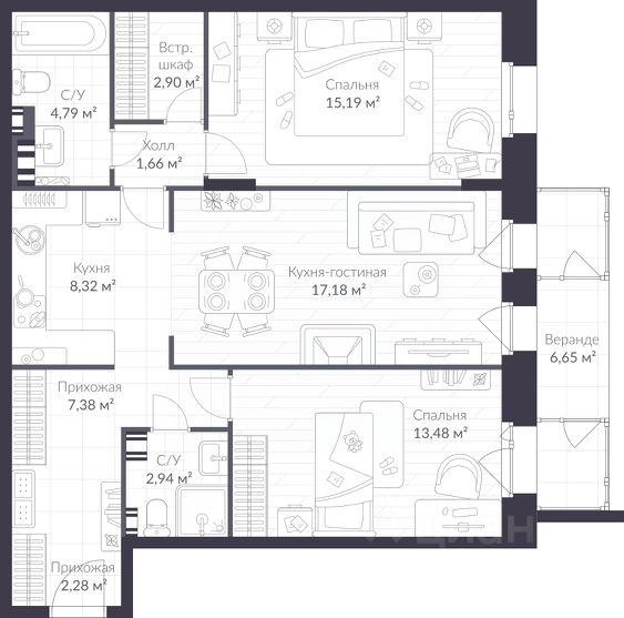 Просторная кухня-гостиная (17,13) и две изолированные комнаты (14,18 и 12,43)— идеальное решение для семьи. Два совмещенных санузла (с ванной и душевой) для вашего удобства, лоджия (3,67) с французским остеклением (от потолка до пола).