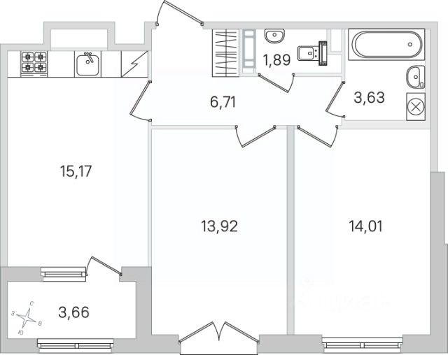 Эргономичная планировка: кухня-гостинная - 19,5 кв.м с выходом на балкон 3,6 кв.м., две квадратная комната 14,3+14,3 кв.м.
