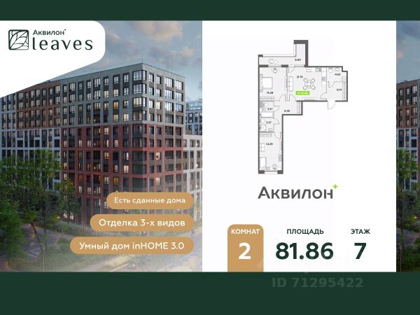 Купи квартиру в ЖК "Аквилон Ливз"! Отделка В квартире выполнена предчистовая отделка WhiteBox +Возможен дозаказ отделки в любом из 3 цветов: SAND, TERRA, GRAPHITE Отделка входит в стоимость квартиры в ДДУ ЖК "Аквилон Ливз" Жилой комплекс класса бизнес-лайт "Аквилон Leaves" воплощает идеальную синергию природы, технологий и дизайна. В одном из самых престижных районов Санкт-Петербурга мы создаем функциональную жилую среду, которая позволит максимально быстро и удобно решать бытовые вопросы, сохраняя ценное время для семьи и любимых занятий. -Малошумные лифты -Сквозные парадные -Светопрозрачные входные группы -Увеличенная высота первого этажа -Безбарьерная среда -Подземный паркинг Стандарты Группы Аквилон для вашей комфортной жизни Thermo-S экономия на коммунальных платежах за счет дополнительно утепленных стен, кровли и цоколя. Энергоэффективные окна с селективным покрытием и аргоновым заполнением Soundstop - дополнительная шумоизоляция внутренних перегородок и межэтажных перекрытий, шумозащитные окна, малошумные лифты Light-in - в квартирах устанавливаются широкоформатные окна, увеличены на 30%. Высота подоконников на уровне 60 см от пола. Vent-in - в каждой комнате есть клапаны индивидуальной вентиляции, которые обеспечивают приток свежего воздуха с улицы. inHOME умный дом в каждой квартире Интеллектуальная цифровая система, которая позволит дистанционно решать бытовые вопросы, управлять квартирой и экономить на оплате коммунальных услуг. В состав inHOME входят: IP-домофон, Face key, "умные" счетчики, датчики протечки, дистанционное отключение розеток, и т.д. Двор ваш личный парк Благоустройство двора от студии ландшафтного дизайна MEGABUDKA отсылает нас к образу зеленого листа. Современная архитектура гармонирует с окружающей средой, а экологические стандарты и "умные" системы обеспечивают ежедневный комфорт. -Зонирование на площадки для активного и спокойного отдыха. -Ландшафт с геопластикой и рельефом напоминает естественную красоту природных парков. -Всесезонные растения -Высаживаются взрослые деревья и кустарники Локация и инфраструктура Помимо разнообразной инфраструктуры, рядом с комплексом расположен Пулковский парк и сад "Дубовая роща". У жителей будут все возможности для отдыха на свежем воздухе. Велопрогулка, пробежка или летний пикник наслаждайтесь природой, не уезжая далеко загород. -10 мин. до м. Московская -15 мин. до м. Звездная -15 мин. до аэропорта Пулково -30 мин. до Невского пр. #2UCe09 Купить 2-комнатную квартиру первичка на улице Среднерогатская в Санкт-Петербурге.