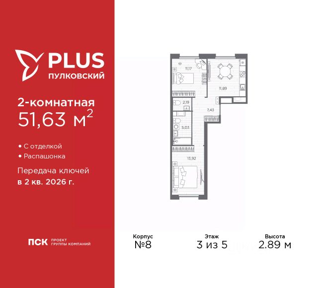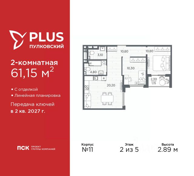 Продается двухкомнатная квартира от застройщика с отделкой в ЖК "PLUS Пулковский" на 3 этаже. Общая площадь: 60.15 кв.м., жилая: 21.1 кв.м., площадь просторной кухни-столовой: 20.2 кв.м. Квартира угловая, очень светлая, естественная вентиляция при открытии окон. В квартире одна лоджия, один совмещенный и один раздельный санузел. Высота потолков 2.89 м.