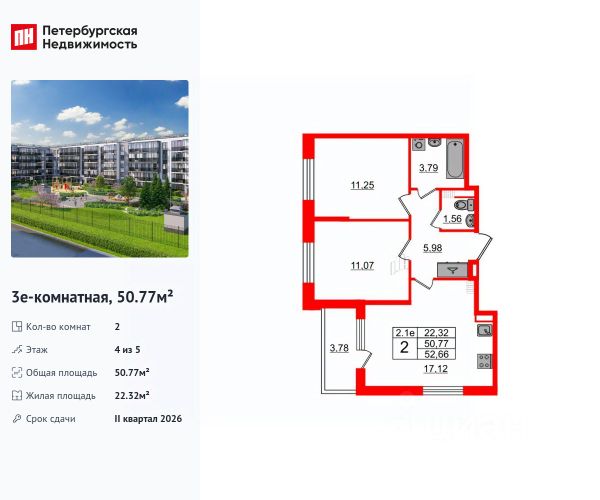 Дом монолитный, многоподъездный, высотой 5 этажей. Квартира находится в 5-й секции в корпусе 6. На этаже 11 квартир. В подъезде 1 грузовой лифт. Окончание строительства - 2 квартал 2026 года. Оформление сделки по договору долевого участия.