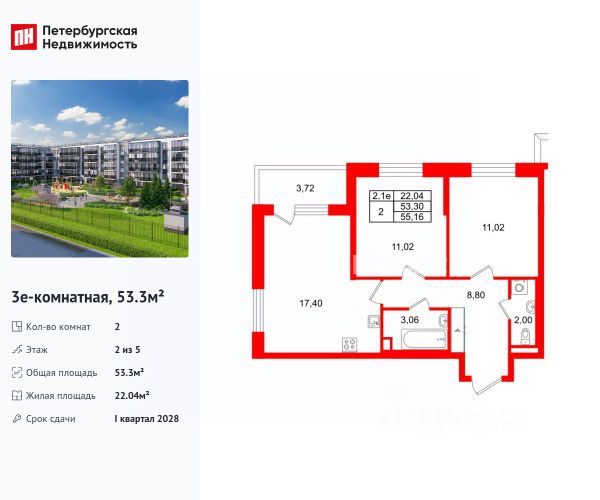 Продается уютная 2-комнатная квартира от застройщика в жилом комплексе "Парадный ансамбль" в престижном Московском районе. До метро можно добраться на транспорте всего за 20 минут. Удобная, классическая, функциональная европланировка, большая кухня-гостиная 17.3 м², вместительная прихожая 6.09 м². Общая площадь квартиры - 51.15 м², жилая 22.19 м², высота потолка 2.77 м. Квартира продается с отделкой "Норд Лайн серый". Что особенного в ЖК "Парадный ансамбль"? • Инновационный Лицей Setl с оригинальной архитектурной концепцией и уникальной образовательной средой • Масштабное малоэтажное строительство в престижном Московском районе • Рекреационные зоны: парадный парк в центре квартала, ручей с собственной набережной, центральная площадь, ресторанный комплекс и пешеходный бульвар • Фасады из керамогранита и кирпича с яркими и акцентными входными группами • Две самые большие площадки Setl Kids и Setl Sport • Уникальные квартиры.High Flat на последних этажах, палисадники у квартир на первом этаже, семейные секции, квартиры с саунами и окном в ванной