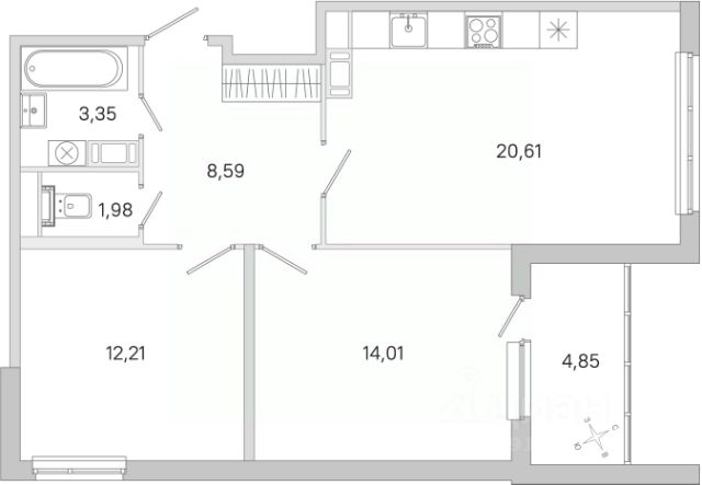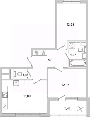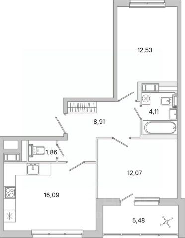 Просторная прихожая 10,2 м, кухня 12,1 м, комнаты 16 м и 15,8 м, санузел раздельный.