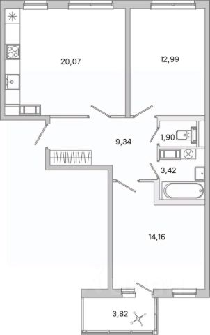 Просторная прихожая 10,2 м, кухня 12,1 м, комнаты 16 м и 15,8 м, санузел раздельный.