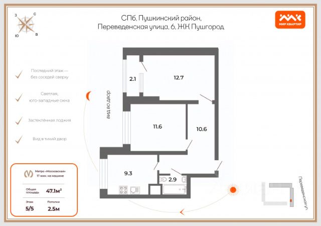 Арт. 129424786 Светлая 2-комнатная 47,1 м² с лоджией на последнем этаже — тихо, уютно, готова к заезду! ЛОКАЦИЯ Район с многоквартирной малоэтажной застройкой. Семейная жизнь без суеты: в пешей доступности школа, детские сады, поликлиника и спортивные секции, медцентры, стоматология, супермаркеты, кафе, рестораны, кофейни, пекарни. Рядом расположена ледовая арена "Пулковские высоты", в которой можно заниматься хоккеем, фигурным катанием и просто кататься на коньках, и конный клуб "Райдер", где можно обучаться верховой езде с опытными тренерами. Отличная транспортная доступность: удобный выезд на Пулковское шоссе и Витебский проспект и общественный транспорт как до ст.м. Московская и Звездная, так и до красивейших парков Пушкина. ДОМ Дом построен из железобетонных конструкций с навесными фасадами и облицовкой из керамогранита. Несмотря на малоэтажность, в подъездах установлены просторные лифты. В квартирах тройное остекление, лоджии с алюминиевыми блоками. Придомовая территория благоустроена: клумбы, цветники, детская площадка и парковка для жителей. КВАРТИРА 2-комнатная квартира общей площадью 47,1 м². Расположена на последнем, 5-м (мансардном) этаже — тишина и отсутствие соседей сверху. Планировка удобная и функциональная: - две изолированные спальни - отдельная кухня - застеклённая лоджия - окна выходят на юго-запад — квартира светлая - вид во двор, без шума дороги Квартира с косметическим ремонтом — можно заехать и жить. Формат подходит для комфортного проживания семьи, пары или сдачи в аренду. УСЛОВИЯ СДЕЛКИ Один собственник Без обременений Прямая продажа Предлагаем ПРЕМИАЛЬНОЕ обслуживание для требовательных клиентов. Оперативно организуем просмотр, предоставим полную информацию по объекту. 20 лет работы с требовательными клиентами подготовили нас к решению ВАШИХ сложных задач. Будем рады знакомству! Ул. Рубинштейна, д.8.