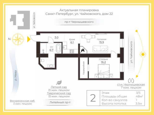 Квартира общей площадью 48 м расположена на 3м этаже пятиэтажного дома, откуда открывается вид на красивейший особняк Нарышкиных-Трубецких, функционирующий как музей и место проведения выставок. Из окон также видно зеленый газон с деревьями, памятник Петру и Февронии, покровителям семьи, установленный напротив Дворца обручальных колец.