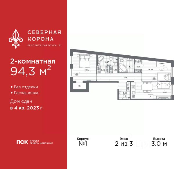 Просторная двухкомнатная квартира в ЖК "Северная корона" на 2 этаже. Квартира без отделки, после оформления собственности можно делать ремонт. Общая площадь: 96.8 кв.м., жилая: 36.41 кв.м., площадь просторной кухни-столовой: 32.35 кв.м. Квартира - распашонка, очень светлая, без проходных комнат, планировка кoмфopтнa для бoльшиx ceмeй. В квартире один совмещенный и один раздельный санузел. Высота потолков 3.0 м. Дом монолитный, трехподъездный, высотой 8 этажей. Квартира находится в 1-й секции в корпусе 8.1. На этаже 3 квартиры. В подъезде 1 грузовой лифт. Строительство окончено, дом сдан в 4 квартале 2023 года. Оформление сделки по договору купли-продажи. В шаговой доступности от жилого комплекса находятся станции метро (расстояние по прямой): "Петроградская" (500 м), "Чкаловская" (1.3 км), "Горьковская" (1.7 км), "Чёрная речка" (1.7 км), также недалеко от этого корпуса расположены станции метро: "Чернышевская", "Спортивная". Премиальный жилой комплекс "Северная корона" расположился в парадной части Петроградской стороны на пересечении ее главного проспекта — Каменноостровского и набережной реки Карповки. Двухсотметровое парадное лобби, дизайнерский ландшафт, собственная фитнес-студия, парадная гостиная для встреч и переговоров, игровой клуб для детей. А также: системы очистки и подготовки воды и воздуха, консьерж-сервис, бесключевой доступ, помещения для ожидания и многое другое. Архитектура премиального дома "Северная корона" — это современное воплощение и новое развитие архитектуры северного модерна. Особенность и уникальность дома в его протяженности вдоль реки Карповки. Фасад исключает монотонность, линии интегрированы в канву курдонера и внутренних общественных пространств, обращённых как в сторону Каменноостровского проспекта, так и Иоановского монастыря. Все квартиры в полной мере можно назвать видовыми они открыты историческому окружению и ландшафтной архитектуре. Что дарит владельцам единственные в своем роде захватывающие виды. Этажность: 4 - 9 этажей (в т.ч. 1 подземный) Дом СДАН. Класс проекта: Премиум класс Уникальность проекта: - Французские балконы - Видовые квартиры - Панорамное остекление - Потолки до 3,5 метров - Мансардные окна - Индивидуальные сплит шахты - Считывание номеров автомобилей - Современная архитектура и инженерия - Двор парк - Центральное лобби 200 кв.м. #ZMbtbF