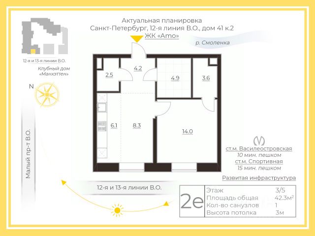 Стрелка Васильевского острова, пешеходный Андреевский бульвар и Василеостровский рынок- в пешей доступности.
