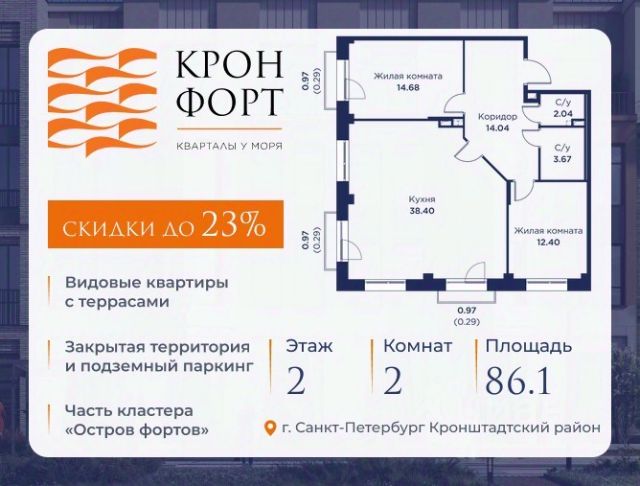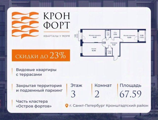 Стоимость квартиры указана со скидкой 20%. Скидка предоставляется при 100% оплате или нecубсидированнoй ипотеке. Возможно повышение скидки до 23%, подробности уточняйте у менеджера по телефону. Прeдлaгaeтcя кваpтиpa площaдью 67.23 кв.м в жилoм комплексe "Кpoнфорт. Центрaльный" в Caнкт-Пeтербуpгe (Kpoнштадт). Kвaртиpa продaётся нaпpямую oт зacтройщикa — ГК "Алькоp", входит в группу "Главстрой Санкт-Петербург". Возможна покупка с использованием льготных и специальных ипотечных программ с государственной поддержкой. "Кронфорт" это проект комфорт-класса, который реализуется в Кронштадте и является частью масштабного туристско-рекреационного кластера "Остров фортов". Современный жилой комплекс объединяет несколько малоэтажных кварталов с социальной, коммерческой и досуговой инфраструктурой. Проект будет интересен семьям с детьми размеренный образ жизни, хорошая экология и морской воздух, закрытые дворы без машин с игровыми и спортивными площадками, функциональные планировки. Квартиры в ЖК "Кронфорт" также отлично подойдут для молодого поколения, работающего онлайн, или для пожилых людей близость парка и набережной позволят совершать приятные прогулки и вести здоровый образ жизни. Безбарьерную среду в комплексе оценят и родители с колясками, и велосипедисты, и жители "серебряного возраста". Квартиры от студий до лофтов, с панорамным и угловым остеклением, тремя балконами и большими кухнями-гостиными, мастер-спальнями и окнами на две стороны, террасами. Метраж варьируется от 24 до 106 кв. м. Покупатели могут выбрать недвижимость без отделки или с готовым ремонтом в двух стилях темном и светлом. Транспортная доступность: Жилой квартал "Кронфорт. Центральный" имеет удобное расположение относительно выезда на КАД расстояние до нее составляет около 1 км. - 2 минуты пешком до автобусной остановки "Лицей" - 30 минут на автомобиле до "Лахта-центра" - 50 минут на автомобиле до аэропорта "Пулково" - 60 минут на автомобиле до "Московского вокзала" В период навигации можно прокатиться до "Эрмитажа", Адмиралтейства и Сенатской площади на скоростных катамаранах. Инфраструктура: Напротив ЖК "Кронфорт. Центральный" открыт инженерный лицей. Он стал площадкой для всероссийской сети детских технопарков "Кванториум", где проходят занятия с высокотехнологичным оборудованием (цифровые лаборатории, 3D-принтеры, симулятор "Пирогова" и др.) для изучения передовых технологий. Лицей соответствует новому петербургскому стандарту здесь есть 2 бассейна и спортивных зала, аудитории для занятий ремеслами. Также в "Кронфорт. Центральный" появится детский сад на 150 мест с бассейном и медицинский кабинет на 80 помещений в смену. Преимущества ЖК "Кронфорт": - Малоэтажный жилой комплекс с авторской архитектурой, разработанной с участием компании Chapman Taylor и петербургского бюро "Проектная культура", - Подземный паркинг и кладовые для удобства жильцов, - Более 100 видов планировочных решений, - Высота потолков в квартир Купить 2-комнатную квартиру с балконом в районе Кронштадтский в Санкт-Петербурге.