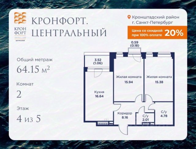Стоимость квартиры указана со скидкой 20%. Скидка предоставляется при 100% оплате или несубсидированной ипотеке. Предлагается квартира площадью 67.57 кв.м в жилом комплексе "Кронфорт. Центральный" в Санкт-Петербурге (Кронштадт). Возможна покупка с использованием льготных и специальных ипотечных программ с государственной поддержкой. Высота потолков в квартирах — от 3 до 3,4 метров, окна увеличенного размера, есть варианты с эркерами, французскими балконами, лоджиями и террасами. Жилой квартал состоит из пяти четырехэтажных корпусов с закрытыми охраняемыми дворами, свободными от машин. Первые этажи формируют торговые променады в стиле пешеходных улиц исторической части Петербурга и Кронштадта. Внутренние пространства между корпусами — пешеходные зоны с уютными площадями. Архитектурный облик квартала разработан бюро "Проектная культура" и международной компанией Chapman Taylor. Инфраструктура комплекса включает: - Лицей с двумя бассейнами - Детский сад на 150 мест с бассейном и закрытой территорией - Веревочный парк - Игровые площадки для активного отдыха; - Кабинет врача общей практики. - Подземные паркинги с лифтами. - Мусоросборные камеры, индивидуальные кладовые. - Закрытые дворы с контролем доступа и видеонаблюдением. - Мультформатный стрит-ретейл с кафе и ресторанами. - Триатлон-центр и беговые/велодорожки. - Учебно-тренировочный комплекс для детей "Лагерь настоящих героев". Транспортная доступность обеспечивает удобный выезд на КАД (около 1-3 км), 2 минуты пешком до автобусной остановки "Лицей", 25 минут до Сестрорецка, 30 минут до "Лахта-центра", 50 минут до аэропорта "Пулково" и 60 минут до Московского вокзала. Для любителей моря доступен маршрут на "Метеоре" до центра Санкт-Петербурга. Отделка квартир предлагается как с готовой чистовой отделкой, так и со свободной планировкой без отделки для реализации индивидуальных дизайнерских решений. В третьем корпусе, продажи которого стартовали в марте 2025 года, доступны квартиры с просторными террасами, тремя балконами, кухнями-гостиными до 38 кв.м с окнами на две стороны, обеспечивающими панорамное освещение и виды. Если вам нужна помощь с оформлением ипотеки или дополнительная информация по комплексу и условиям покупки, обращайтесь в отдел продаж за консультацией. Купить 2-комнатную квартиру с балконом в районе Кронштадтский в Санкт-Петербурге.