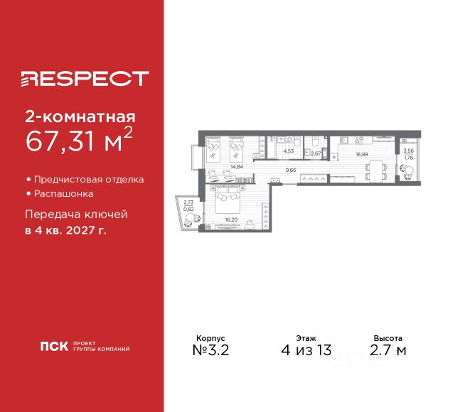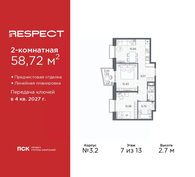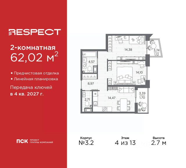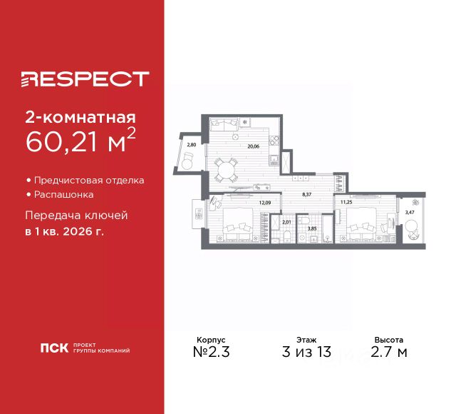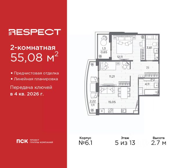 Продается двухкомнатная квартира с предчистовой отделкой в ЖК "RESPECT" на 2 этаже. Общая площадь: 56.1 кв.м., жилая: 23.32 кв.м., площадь просторной кухни-столовой: 15.05 кв.м. Комнаты изолированные, все окна выходят на одну сторону. В квартире один балкон и одна лоджия, два совмещенных санузла. Терраса представляет собой роскошную зону отдыха, где вы на свой вкус можете создать атмосферу комфорта и уюта. Высота потолков 2.7 м. Квартира находится в корпусе 6. Дом монолитный, одноподъездный, высотой 13 этажей. На этаже 8 квартир. В подъезде 1 пассажирский и 1 грузовой лифт. Окончание строительства - 4 квартал 2026 года. Оформление сделки по договору долевого участия. В шаговой доступности от жилого комплекса расположены станции метро (расстояние по прямой): "Лесная" (800 м), "Площадь Мужества" (1.4 км), "Выборгская" (1.9 км), также недалеко от этого корпуса находятся станции метро: "Академическая", "Политехническая". Квартал строится на Полюстровском пр, 87, в одной из самых востребованных локаций Петербурга. В 10 минутах пешком - метро "Лесная" и в 10 минутах на транспорте - Петроградская сторона. Высота домов от 7 до 13 этажей. На территории Respect строится школа на 1125 учащихся и детский сад на 240 мест. Запроектированы собственная газовая котельная, закрытая территория, дворы без машин и подземные паркинги с лифтами. Вентилируемые фасады облицованы клинкерным кирпичом. Дома из этого материала служат веками, являясь гордостью хозяев. Дизайн парадных зон и входных групп - сочетание лаконичности отделки и декоративных элементов с текстурами из натурального камня и дерева с приглушенной подсветкой теплым светом. Во входных группах расположены гостевые зоны с мягкой мебелью. Вся территория квартала будет связана единой концепцией благоустройства, разработанной ландшафтным бюро L.BURO. В основе - идея создания увлекательного ландшафтного пространства для насыщенной жизни, включающего в себя пейзажные зоны, современные архитектурные композиции, открытые террасы на стилобатах с зонами отдыха и парклетами, спортивными площадками. Это пространство для людей всех возрастов и различных увлечений. На эксплуатируемой кровле на уровне первого этажа в домах 1 и 4 будут обустроены общественные видовые террасы. В квартале запроектированы внутренние закрытые территории дворов домов без доступа автомобилей и безбарьерная среда для велосипедистов и колясок. Предусмотрены IP-домофония с функцией дистанционного открывания калиток и парадных, а также дистанционный сбор показаний счетчиков и мобильное приложение для жителей. Для безопасности жителей квартала - круглосуточное видеонаблюдение и служба охраны. В каждой квартире предусмотрены внешние корзины для кондиционеров. #Z6BaEE