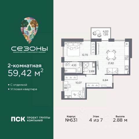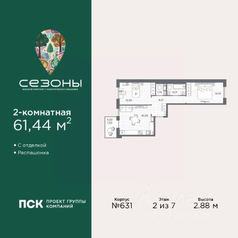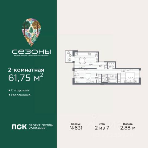 Продается 2-комн. квартира от застройщика с предчистовой отделкой в ЖК "Сезоны" на 2 этаже. Общая площадь: 54.34 кв.м., жилая: 23.54 кв.м., площадь просторной кухни-столовой: 17.09 кв.м. Квартира угловая, идеально подойдет любителям тишины и панорамных видов. В квартире один балкон, два совмещенных санузла. Высота потолков 2.88 м. Дом монолитный, многоподъездный, высотой 7 этажей. Квартира находится в 1-й секции в корпусе 611. На этаже 4 квартиры. В подъезде 1 грузовой лифт. Начало строительства - 4 квартал 2025 года. Окончание строительства - 2 квартал 2028 года. Оформление сделки по договору долевого участия. Видовой жилой комплекс "Сезоны" от ГК ПСК возводится в одном из самых востребованных и престижных районов Санкт-Петербурга - Приморском, рядом с Суздальским и Выборгским шоссе. Такое расположение обеспечивает удобный выезд в разные части города, сочетая городской комфорт с близостью к природе. Всего в 50 метрах находится природный заказник "Новоорловский" и речка Каменка, а в пешей доступности - Суздальские озёра. Приморский район отличается развитой социальной и транспортной инфраструктурой. Здесь расположены крупные торговые и деловые центры, современные спортивные объекты, медицинские учреждения, магазины, кафе и рестораны. Комплекс включает четыре корпуса, ввод которых в эксплуатацию запланирован на 2028 год. Проект и прилегающий микрорайон разработаны в соответствии с концепцией "15-минутного города", при которой вся необходимая инфраструктура находится в шаговой доступности. В ближайшем окружении - две школы, пять детских садов, магазины, кафе, салоны красоты, банковские отделения и пункты выдачи заказов. Также предусмотрены два четырёхъярусных паркинга с лифтами на 288 машиномест. О застройщике ГК ПСК - один из крупнейших девелоперов Санкт-Петербурга с более чем 18-летней историей. Компания реализует проекты во всех сегментах недвижимости - от премиальных жилых комплексов до масштабных кварталов комфорт-класса и апарт-отелей. По данным портала ЕРЗ.РФ, ПСК входит в ТОП-3 крупнейших застройщиков Санкт-Петербурга по объёму текущего строительства. Портфель компании превышает 3 млн кв. м жилой и коммерческой недвижимости. Все объекты сдаются строго в срок и отличаются высоким уровнем архитектурных и инженерных решений. #2tOOua