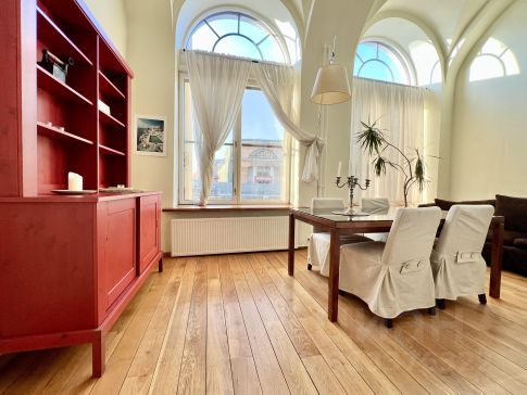 Квартира уникальна не только расположением, но и своей планировкой в двух уровнях. Общая площадь 70,7 кв.м. На первом уровне почти квадратная прихожая 7,7 кв.м, санузел 6 кв.м с полноценной ванной и нишей для стиральной машины, просторная кухня-столовая 17,8 кв.м и комната отдыха 15 кв.м, из которой по изящной лестнице Вы поднимаетесь на второй уровень в мансарде с комнатой 20,6 кв.м. На полу в кухне и комнатах благородная паркетная доска, в прихожей и ванной плитка. Высота потолка на первом уровне 3,15м, на мансарде от 2,6м до 3,6м. Квартира свободна для меблировки под Ваш вкус и потребности, кухня из дерева с варочной панелью и встроенным холодильником остается.