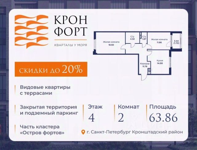 Стоимость квартиры указана со скидкой 20%. Скидка предоставляется при 100% оплате или несубсидированной ипотеке. Предлагается квартира площадью 46.68 кв.м в жилом комплексе "Кронфорт. Центральный" в Санкт-Петербурге (Кронштадт). Возможна покупка с использованием льготных и специальных ипотечных программ с государственной поддержкой. Высота потолков в квартирах — от 3 до 3,4 метров, окна увеличенного размера, есть варианты с эркерами, французскими балконами, лоджиями и террасами. Жилой квартал состоит из пяти четырехэтажных корпусов с закрытыми охраняемыми дворами, свободными от машин. Первые этажи формируют торговые променады в стиле пешеходных улиц исторической части Петербурга и Кронштадта. Внутренние пространства между корпусами — пешеходные зоны с уютными площадями. Архитектурный облик квартала разработан бюро "Проектная культура" и международной компанией Chapman Taylor. Инфраструктура комплекса включает: - Лицей с двумя бассейнами - Детский сад на 150 мест с бассейном и закрытой территорией - Веревочный парк - Игровые площадки для активного отдыха; - Кабинет врача общей практики. - Подземные паркинги с лифтами. - Мусоросборные камеры, индивидуальные кладовые. - Закрытые дворы с контролем доступа и видеонаблюдением. - Мультформатный стрит-ретейл с кафе и ресторанами. - Триатлон-центр и беговые/велодорожки. - Учебно-тренировочный комплекс для детей "Лагерь настоящих героев". Транспортная доступность обеспечивает удобный выезд на КАД (около 1-3 км), 2 минуты пешком до автобусной остановки "Лицей", 25 минут до Сестрорецка, 30 минут до "Лахта-центра", 50 минут до аэропорта "Пулково" и 60 минут до Московского вокзала. Для любителей моря доступен маршрут на "Метеоре" до центра Санкт-Петербурга. Отделка квартир предлагается как с готовой чистовой отделкой, так и со свободной планировкой без отделки для реализации индивидуальных дизайнерских решений. В третьем корпусе, продажи которого стартовали в марте 2025 года, доступны квартиры с просторными террасами, тремя балконами, кухнями-гостиными до 38 кв.м с окнами на две стороны, обеспечивающими панорамное освещение и виды. Если вам нужна помощь с оформлением ипотеки или дополнительная информация по комплексу и условиям покупки, обращайтесь в отдел продаж за консультацией.