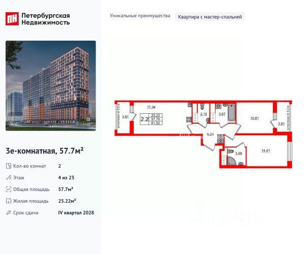 Цена действует при 100% оплате и на определенные ипотечные программы. Подробности — в отделе продаж по телефону. Продается 2-комнатная квартира в ЖК "Октябрьская набережная" на 23 этаже. Общая площадь составляет 53.30 кв. м. Квартира с чистовой отделкой . Жилой комплекс "Октябрьская набережная" располагается по адресу Санкт-Петербург, Невский. Октябрьская набережная - жилой комплекс на берегу Невы, который отличается живописными видами и удобным местоположением: в окрестностях ЖК есть всё необходимое для комфортной жизни. Расположение: • 2 минуты пешком до набережной Невы; • 7 минут до станции метро "Улица Дыбенко" на автомобиле; • 8 минут до Большого Обуховского моста на автомобиле; • 15 минут до ТРК "Лондон Молл" на автомобиле. Будущие жильцы могут обустроить квартиру по своему вкусу: предлагается 2 вида отделки - уютный темный "Comfort Wood" и легкий светлый "Comfort Stone". Отделка выполняется из качественных материалов: прочный ламинат с фактурой светлого дерева или белого камня, светлые обои под покраску, лаконичные межкомнатные двери. Вход в парадные расположен на уровне земли и создает доступную среду для пожилых людей, людей с ограниченными возможностями и мам с колясками. На цокольном этаже находятся кладовые, которые позволят освободить пространство квартиры от лишних вещей. Во всех парадных расположены колясочные, рядом с ними - велопарковки. На территории комплекса есть всё для любителей активного отдыха: спортивные площадки, уличные тренажеры, велодорожки, места для игры в баскетбол и волейбол. Спортсмены могут насладиться живописными видами во время пробежки вдоль набережной. В зелёных и облагороженных дворах есть всё и для семей с детьми: тематические площадки, детский сад и даже школа. Комфортная среда для питомцев - еще одно преимущество "Октябрьской набережной": рядом с домами находится площадка для выгула собак. Для удобства автомобилистов на территории комплекса устроены крытые паркинги с безопасными охраняемыми выездами и большим количеством машино-мест. В пешей доступности расположены супермаркеты, кафе, парикмахерские, отделения банков. Преимущества: • Первая береговая линия • Двор без машин • Доступная среда • Развитая инфраструктура • Школа и детский сад во дворе • Близость к метро Успейте приобрести квартиру на выгодных условиях! Чтобы узнать подробности, обращайтесь за консультацией по телефону.