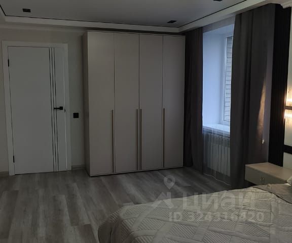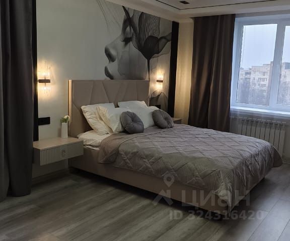 В спальне 2-х спальная кровать с ортопедическим матрасом и подъемным механизмом с системой хранения, туалетный столик с зеркалом с подсветкой и пуфиком, над прикроватными тумбами подвесные светильники с теплым светом, подвесной смарт ТВ напротив кровати!