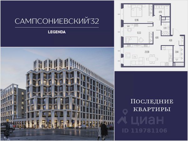 Квартира с двумя спальнями в комплексе "Сампсониевский 32" от LEGENDA на 2 этаже. -Общая площадь: 65.91 кв.м. -Жилая: 24.58 кв.м. -Площадь просторной кухни-столовой: 24.33 кв.м. -Высота потолков 2.7 м. Комнаты изолированные, все окна выходят на одну сторону. В квартире один раздельный санузел. ЖК "Сампсониевский, 32" квартал бизнес-класса в Выборгском районе Санкт-Петербурга недалеко от набережной Большой Невки и Петроградской стороны. Отличают комплекс каскадные фасады с большой площадью остекления, видовые квартиры с террасами. Современные инженерные и технические решения, повышающие качество жизни TechnoBox включают в себя: стационарный и удаленный контроль дома, систему Air Design, обеспечивающую чистый воздух без лишнего шума, мультисервисную сеть, объединяющую коммуникационные системы. Квартиры сдаются с предчистовой отделкой: выровнены пол и стены, проведена электрика, предусмотрена шумоизоляция, встроенная система вентиляции. В каждой квартире установлена взломостойкая входная дверь, окна со специальным термоизолированным алюминиевым профилем. В ЖК "Сампсониевский, 32" много вариантов планировок: квартиры с террасой, мастер-спальней, ванной комнатой с окном, гардеробной комнатой. Двор закрыт от транспорта, здесь будут зоны с дизайнерским оформлением для игр и отдыха. Срок сдачи 4 квартал 2026 года. В отапливаемом подземном паркинге 298 мест, спуститься туда можно на лифте из своей квартиры. Комплекс находится на границе крупных районов, рядом с набережными, которые ведут в Приморский, Калининский и Центральный районы, а через Сампсониевский, Гренадёрский и Кантемировский мосты можно попасть в Петроградский район. До станции метро "Выборгская" 900 м, до станции метро "Петроградская" 2,6 км. Финляндский вокзал находится в 2,5 км от ЖК, а Западный скоростной диаметр (ЗСД) в 10 км. Рядом с ЖК находится несколько гимназий, общеобразовательных школ и детских садов. Здесь много медицинских учреждений, кафе, ресторанов, торговых центров, гипермаркетов. Меньше чем в 1 км от ЖК Сампсониевский и Выборгский сады, а в 2 км находится Ботанический сад, набережная реки Карповки с качелями и зонами отдыха у воды.