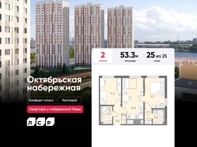 Цена действует при 100% оплате и на определенные ипотечные программы. Подробности — в отделе продаж по телефону. Продается 2-комнатная квартира в ЖК "Октябрьская набережная" на 23 этаже. Общая площадь составляет 53.30 кв. м. Квартира с чистовой отделкой . Жилой комплекс "Октябрьская набережная" располагается по адресу Санкт-Петербург, Невский. Октябрьская набережная - жилой комплекс на берегу Невы, который отличается живописными видами и удобным местоположением: в окрестностях ЖК есть всё необходимое для комфортной жизни. Расположение: • 2 минуты пешком до набережной Невы; • 7 минут до станции метро "Улица Дыбенко" на автомобиле; • 8 минут до Большого Обуховского моста на автомобиле; • 15 минут до ТРК "Лондон Молл" на автомобиле. Будущие жильцы могут обустроить квартиру по своему вкусу: предлагается 2 вида отделки - уютный темный "Comfort Wood" и легкий светлый "Comfort Stone". Отделка выполняется из качественных материалов: прочный ламинат с фактурой светлого дерева или белого камня, светлые обои под покраску, лаконичные межкомнатные двери. Вход в парадные расположен на уровне земли и создает доступную среду для пожилых людей, людей с ограниченными возможностями и мам с колясками. На цокольном этаже находятся кладовые, которые позволят освободить пространство квартиры от лишних вещей. Во всех парадных расположены колясочные, рядом с ними - велопарковки. На территории комплекса есть всё для любителей активного отдыха: спортивные площадки, уличные тренажеры, велодорожки, места для игры в баскетбол и волейбол. Спортсмены могут насладиться живописными видами во время пробежки вдоль набережной. В зелёных и облагороженных дворах есть всё и для семей с детьми: тематические площадки, детский сад и даже школа. Комфортная среда для питомцев - еще одно преимущество "Октябрьской набережной": рядом с домами находится площадка для выгула собак. Для удобства автомобилистов на территории комплекса устроены крытые паркинги с безопасными охраняемыми выездами и большим количеством машино-мест. В пешей доступности расположены супермаркеты, кафе, парикмахерские, отделения банков. Преимущества: • Первая береговая линия • Двор без машин • Доступная среда • Развитая инфраструктура • Школа и детский сад во дворе • Близость к метро Успейте приобрести квартиру на выгодных условиях! Чтобы узнать подробности, обращайтесь за консультацией по телефону.