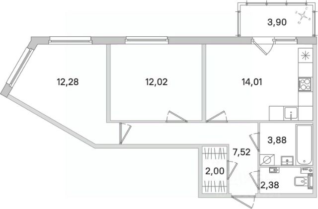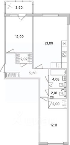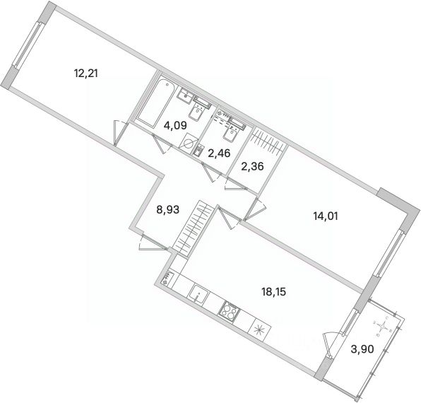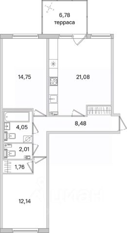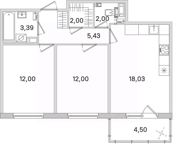 Просторная кухня-гостиная (17,13) и две изолированные комнаты (14,18 и 12,43)— идеальное решение для семьи. Два совмещенных санузла (с ванной и душевой) для вашего удобства, лоджия (3,67) с французским остеклением (от потолка до пола).