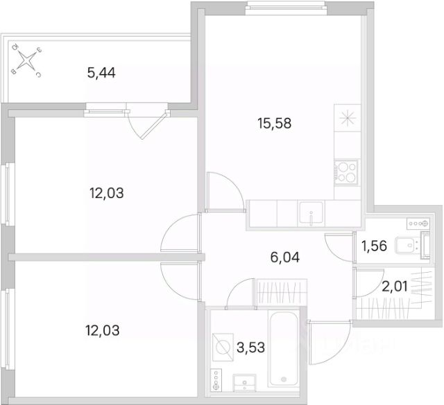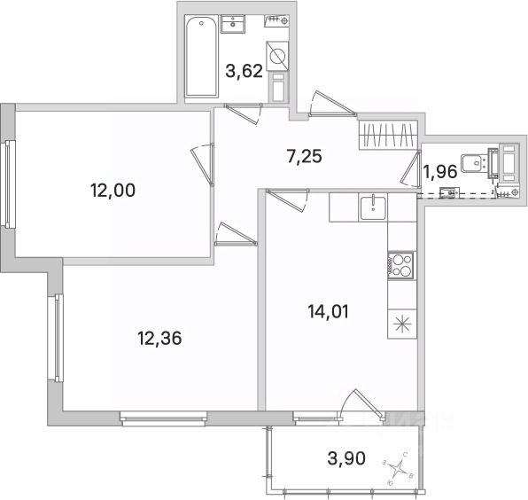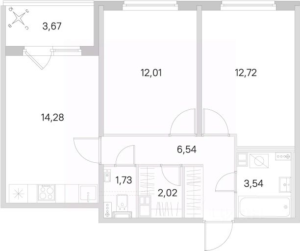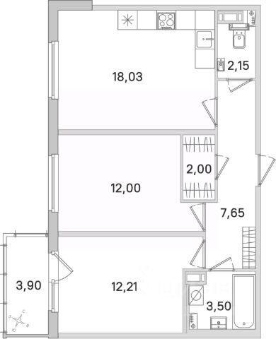 Просторная кухня-гостиная (17,13) и две изолированные комнаты (14,18 и 12,43)— идеальное решение для семьи. Два совмещенных санузла (с ванной и душевой) для вашего удобства, лоджия (3,67) с французским остеклением (от потолка до пола).