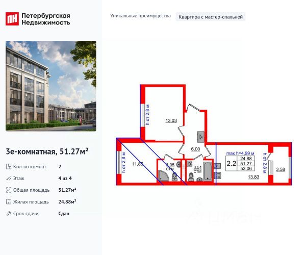 • ✅ Минимальная площадь: 51,3 м²