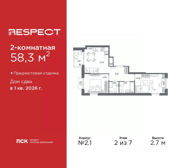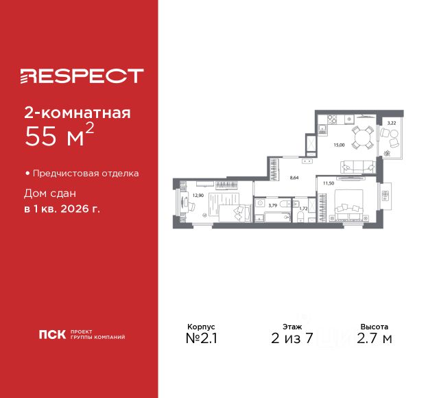 Продается 2-комн. квартира с отделкой в ЖК "RESPECT" на 12 этаже. Общая площадь: 57.59 кв.м., жилая: 25.54 кв.м., площадь просторной кухни-столовой: 15.11 кв.м. Комнаты изолированные, все окна выходят на одну сторону. В квартире один балкон, один совмещенный и один раздельный санузел. Высота потолков 2.7 м. Дом монолитный, многоподъездный, переменной этажности, от 8 до 13 этажей. Квартира находится в 1-й секции высотой 13 этажей в корпусе 3.3. На этаже 6 квартир. В подъезде 1 пассажирский и 1 грузовой лифт. Начало строительства - 3 квартал 2025 года. Окончание строительства - 4 квартал 2027 года. Оформление сделки по договору долевого участия. В шаговой доступности от жилого комплекса расположены станции метро (расстояние по прямой): "Лесная" (800 м), "Площадь Мужества" (1.4 км), также недалеко от этого корпуса находятся станции метро: "Выборгская", "Академическая", "Политехническая". Жилой квартал "RESPECT" строится на Полюстровском пр, 87, в одной из самых востребованных локаций Петербурга. В 10 минутах пешком - метро "Лесная" и в 10 минутах на транспорте - Петроградская сторона. Высота домов от 7 до 13 этажей. Квартиры сдаются с отделкой white box и с чистовой отделкой. На территории Respect строится школа на 1125 учащихся и детский сад на 240 мест. Запроектированы собственная газовая котельная, закрытая территория, дворы без машин и подземные паркинги с лифтами. В проекте предусмотрены трапециевидные балконы или остекленные лоджии, которые, с одной стороны, исключают монотонность фасада, являясь декоративными элементами, с другой дополнительным функциональным пространством в квартирах. Цветовая гармония фасадов каждого дома раскрывает характер квартала. Коричневый цвет клинкерного кирпича со структурой водяных штрихов — цвет уюта и безопасности, сдержанности и надёжности. Вентилируемые фасады облицованы клинкерным кирпичом. Его высокая прочность позволяет давать 100 лет гарантии на этот материал. Водопоглощение клинкерного кирпича составляет менее 5%, за счет чего у него высокая теплопроводность и прочность. В квартале запроектированы внутренние закрытые территории дворов домов без доступа автомобилей и безбарьерная среда для велосипедистов и колясок. Предусмотрены IP-домофония с функцией дистанционного открывания калиток и парадных, а также дистанционный сбор показаний счетчиков и мобильное приложение для жителей. Для безопасности жителей квартала - круглосуточное видеонаблюдение и служба охраны. В каждой квартире предусмотрены внешние корзины для кондиционеров. Вся территория квартала будет связана единой концепцией благоустройства, разработанной ландшафтным бюро L.BURO. На эксплуатируемой кровле на уровне первого этажа в домах 1 и 4 будут обустроены общественные видовые террасы. Это станет не только привлекательным местом с красивым видом, но и удобным, многофункциональным пространством. Дизайн парадных зон и входных групп - сочетание лаконичности отделки и декоративных элементов с текстурами из натурального камня и Продается 2-комнатная квартира с евроремонтом в районе Калининский в Санкт-Петербурге.