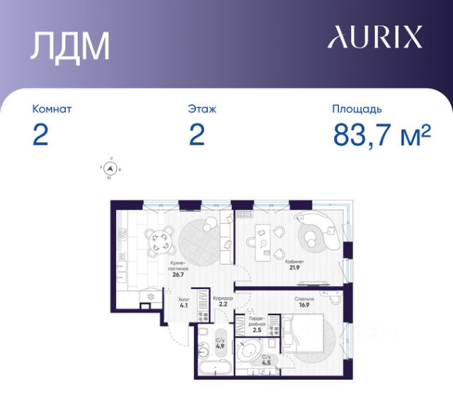 Продается 2-к квартира без отделки в ЖК "ЛДМ". Общая площадь квартиры — 83.7 кв. м, этаж 2 из 9. Тип дома — монолитный. Цена указана при 100% оплате.