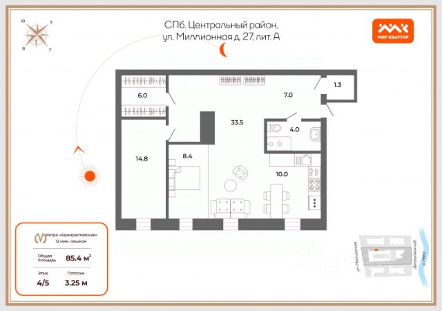 Арт. 77558848 Добрый день, Уважаемый Покупатель! К продаже представлена просторная светлая квартира у Дворцовой площади. Дом расположен в самом сердце парадного Петербурга на знаменитой Миллионной улице, соединяющей Зимний Дворец и Летний сад. В пешей доступности - станция метро Адмиралтейская, Летний сад, Марсово поле, Михайловский Замок, Спас на Крови, Дворцовая набережная, разводные мосты. Такая локация комфортна для активной городской жизни, а также привлекательна для гостей города. Дом построен в 1872 году и является объектом исторического и культурного наследия (в самой квартире охранных элементов нет). В доме проведены работы по замене коммуникаций, электроснабжения, реконструкции крыши. Межэтажные перекрытия - смешанные. Вход в парадную- со двора, двор чистый, просторный, есть шлагбаум и возможность парковки. Парадная приличная, установлена новая входная дверь, лифта нет. В предлагаемой к продаже тихой евро 2-комнатной квартире выполнен ремонт. Удачная планировка сочетает просторную прихожую, кухню- гостиную, отдельную спальню, совмещенный санузел, хозяйственный блок и гардеробную комнату. Высота потолков 3.25 и большие окна делают квартиру светлой, а пространство объемным. Квартира продается со всей мебелью и техникой (посудомоечная и стиральная машины, ТВ, холодильник, газовая плита и духовой шкаф). Объект готов к сделке, один взрослый собственник, обременений нет, прямая продажа. Звоните, оперативно организуем показ, эту квартиру нужно увидеть вживую! Предлагаем ПРЕМИАЛЬНОЕ обслуживание для требовательных клиентов. Оперативно организуем просмотр, предоставим полную информацию по объекту. 20 лет работы с требовательными клиентами подготовили нас к решению ВАШИХ сложных задач. Будем рады знакомству! Ул. Рубинштейна, д.8. 2-комнатная квартира на улице Миллионная в Санкт-Петербурге.