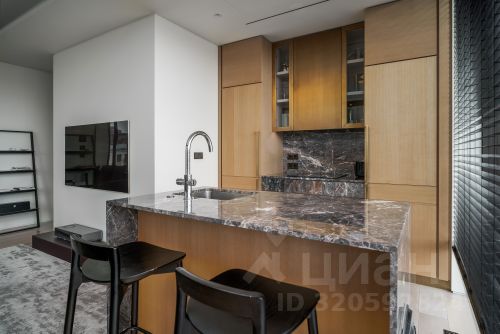 Кухня совмещена с гостиной. Панели шкафов в полную высоту стен, отделанные тонированным ореховым шпоном, со встроенной техникой. Мраморные столешница и фартук с шлифовальной текстурой. Каменный пол с подогревом. Встроенная бытовая техника: варочная панель BOSCH, ПММ, духовой шкаф, холодильник от NEFF. СМА и сушка от BOSCH. Смеситель GROHE Red Duo с бойлером горячей воды. Вся техника 2021 г с паспортами.