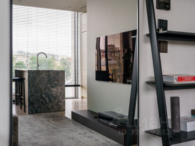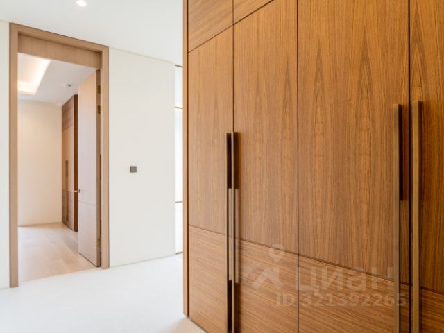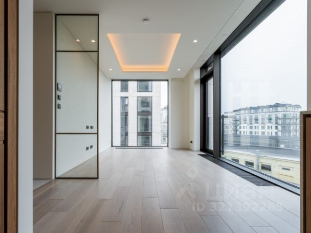 Вид из окон на восток во двор-сад с фонтанами, где высажено 1.500 растений. Абсолютно тихо. Окна высотой 2,6 м, с энергосберегающим стеклопакетом и анодированным алюминиевым профилем цвета бронзы. Стены итальянская штукатурка и специальные обои под роспись. Полы из инженерной доски, белёный дуб без плинтусов. Входные двери, с замком Yale, и межкомнатные двери, высотой 2,5 м, с отделкой из орехового шпона и вставками из тёмного дуба. Порталы дверей из дубового шпона. Гардеробная комната с встроенными шкафами на полную высоту стен с внутренней подсветкой, отделанные тонированным ореховым шпоном. Потолок 3,0 м. Уникальный подиум у окна - место для расслабления и медитации.