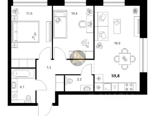 Общая площадь квартиры 65,1 кв.м ПЛЮС две лоджии площадью 4,6 кв.м и 2,2 кв.м
