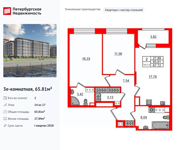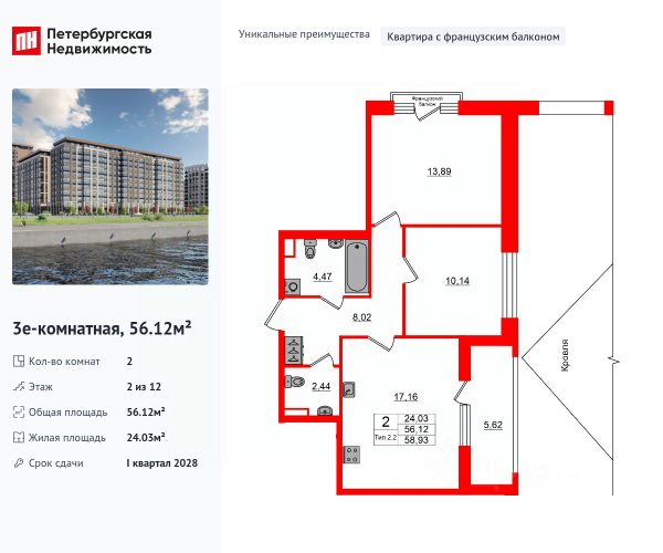 Цена со скидкой до 30% в прямой продаже от застройщика — только в этом месяце. На апартаменты действует беспроцентная рассрочка. Роскошные виды на Неву. 2-к апартамент в комплексе класса бизнес-лайт Зум на Неве на 11-м этаже. Общая площадь 58,76. Без отделки. Зум на Неве расположен в новом месте силы рядом с центром города на первой линии Октябрьской набережной в Невском районе, всего в 7 км от исторической части Санкт-Петербурга. Большой выбор эргономичных и максимально продуманных планировок позволит каждому найти вариант по душе. Панорамные виды на Неву, благоустроенные дворы, детская игровая комната, подземный паркинг, коммерческие зоны на первом этаже, это и многое другое делает Зум на Неве идеальным местом для жизни. Особенности: - Панорамные виды на Неву и город; - 10 мин. до Парка Строителей, 15 мин. до Лондон-молла, Ленты, Максидома, 15 мин. до метро "ул. Дыбенко", 12 мин. до КАД, 10 мин. до центра; - Единая архитектурная концепция. Сдержанные и монументальные фасады в неоклассическом стиле; - Парадный лобби для жильцов. Единый вход в комплекс с администратором, зоной ресепшн и охраной, зоной для бесконтактной доставки посылок и еды; - Подземный отапливаемый паркинг с доступом из парадной; - Доступно 3 варианта отделки на выбор: черновая, предчистовая (White Box) и чистовая; - Зоны отдыха для взрослых и детей, Wi-Fi-покрытие во дворе и в паркинге, зоны для питомцев, арт-объекты и много другое. В шаговой доступности вся необходимая инфраструктура от детских садов и школ до супермаркетов и салонов красоты; - Все происходящее контролируется видеокамерами, а покой внутренней территории и безопасность ваших детей гарантируется полным отсутствием транспорта во дворах в концепции "без машин". Продается 2-комнатная квартира в округе Невский в Санкт-Петербурге.