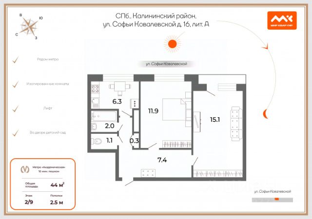 -До станции метро Академическая 25 минут пешком;