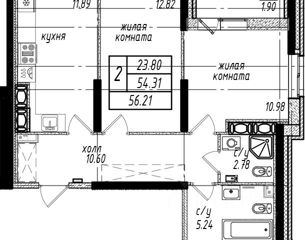 Комната 13,7кв.м., кухня 9,3кв.м, санузел 4,39кв.м., гардеробная 2,3кв.м., балконы 2,37 и 2,41кв.м.