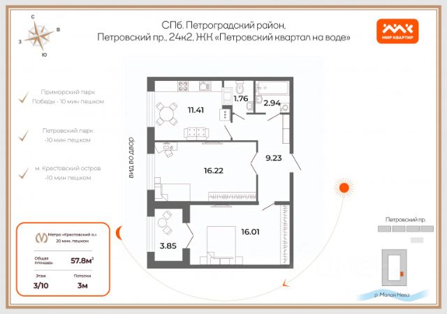 Цена действует при 100% оплате и на определенные ипотечные программы. Подробности — в отделе продаж по телефону. ЖК Нева Хаус - это масштабный проект элитного класса, который возведен застройщиком "ЛСР. Недвижимость - Северо-Запад" в одном из самых зеленых уголков Петроградского района. Он состоит из восьми монолитных разновысотных корпусов, в архитектурном облике которых гармонично сочетаются элементы постмодернизма, классического стиля и современных тенденций. Дизайн-проект ЖК был разработан известным петербуржским архитектором Евгением Герасимовым. Наружные стены домов оснащены износостойкими навесными фасадами и облицованы декоративным клинкерным кирпичом нескольких оттенков. Высота домов в проекте варьируется от 7 до 9 этажей. Комплекс оснащен современным оборудованием, которое обеспечивает жильцам максимальный уровень безопасности и комфорта. Покупателям предлагается разнообразный выбор планировок элитного жилья, начиная от просторных однокомнатных квартир и заканчивая пятикомнатными видовыми пентхаусами. Высота потолков в помещениях составляет 3-3.8 метра. Во всех форматах жилья предусмотрены большие кухни (от 12 кв. м), зонированные прихожие с отдельными гардеробными, увеличенные оконные проемы, ниши для установки кондиционеров и изолированные от бытовых помещений спальни. Разнообразие планировок включает варианты с просторными террасами, объединенными кухнями-гостиными, раздельными санузлами и дополнительными туалетами, эркерами и помещениями нестандартной формы. Площадь квартир - 46.87-300.79 квадратных метров. Базовая стоимость жилья не включает предчистовую или чистовую отделку помещений. В готовых квартирах установлены усиленные дизайнерские двери, оконные блоки с дерево-алюминиевыми рамами из натурального дуба и двойными стеклопакетами, современные отопительные радиаторы, оснащенные регуляторами температуры, и счетчики с функцией автоматического сбора и передачи данных. Закрытые дворы комплекса превращены в уютные прогулочные зоны для детей и взрослых. Застройщик выполнил озеленение пространства, согласно авторскому проекту ландшафтного дизайна, проложил велодорожки и тротуары, организовал закрытую набережную, установил многофункциональные спортивно-игровые городки, беседки, лавочки и стойки для велосипедов. Вся территория ЖК круглосуточно находится под охраной и видеонаблюдением. Для автотранспорта жильцов новостройки предусмотрены подземные паркинги с возможностью доступа из всех парадных на лифте. Их общая вместимость составляет 907 машиномест. Для посетителей организованы наземные стоянки по внешнему периметру территории. Жилой комплекс Нева Хаус находится в элитном районе города в окружении разнообразных объектов инфраструктуры. В пешей доступности работают гимназии, бутики, рестораны, спортивный стадион "Петровский" и филиалы ВУЗов, есть парк и яхт-клуб. Купить квартиру в жилом комплексе Нева Хаус можно в рассрочку или с привлечением ипотечного кредита, в том числе, и на льготных условиях с использованием воен 2-комнатная квартира на проспекте Петровский в Санкт-Петербурге.