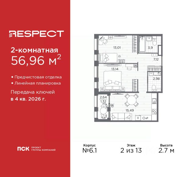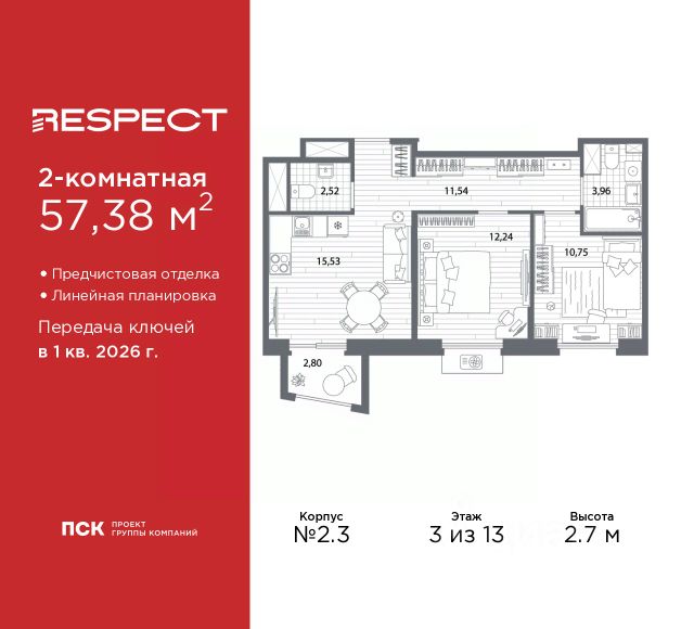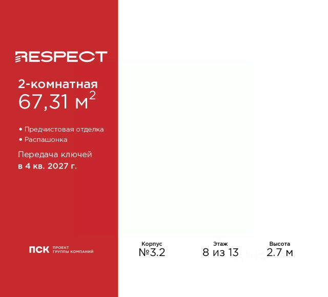 2-комн. квартира от застройщика с предчистовой отделкой в ЖК "RESPECT" на 2 этаже. Общая площадь: 56.1 кв.м., жилая: 23.32 кв.м., площадь просторной кухни-столовой: 15.05 кв.м. Комнаты изолированные, все окна выходят на одну сторону. В квартире один балкон и одна лоджия, два совмещенных санузла. Терраса представляет собой роскошную зону отдыха, где вы на свой вкус можете создать атмосферу комфорта и уюта. Высота потолков 2.7 м. Квартира будет сдана с отделкой WHITE BOX, в которую включены следующие виды работ: - заливка стяжки; - установлена система отопления квартиры; - подготовлены потолки; - все стены выровнены, загрунтованы и отштукатурены; - электрическая проводка разведена по комнатам. Квартира будет готова к чистовой отделке. Квартира находится в корпусе 6. Дом монолитный, одноподъездный, высотой 13 этажей. На этаже 8 квартир. В подъезде 1 пассажирский и 1 грузовой лифт. Окончание строительства - 4 квартал 2026 года. Оформление сделки по договору долевого участия. В шаговой доступности от жилого комплекса расположены станции метро (расстояние по прямой): "Лесная" (800 м), "Площадь Мужества" (1.4 км), "Выборгская" (1.9 км), также недалеко от этого корпуса расположены станции метро: "Академическая", "Политехническая". Жилой квартал "RESPECT" строится на Полюстровском пр, 87, в одной из самых востребованных локаций Петербурга. В 10 минутах пешком - метро "Лесная" и в 10 минутах на транспорте - Петроградская сторона. Высота домов от 7 до 13 этажей. Квартиры сдаются с отделкой white box и с чистовой отделкой. На территории Respect строится школа на 1125 учащихся и детский сад на 240 мест. Запроектированы собственная газовая котельная, закрытая территория, дворы без машин и подземные паркинги с лифтами. В проекте предусмотрены трапециевидные балконы или остекленные лоджии, которые, с одной стороны, исключают монотонность фасада, являясь декоративными элементами, с другой дополнительным функциональным пространством в квартирах. Цветовая гармония фасадов каждого дома раскрывает характер квартала. Коричневый цвет клинкерного кирпича со структурой водяных штрихов — цвет уюта и безопасности, сдержанности и надёжности. Вентилируемые фасады облицованы клинкерным кирпичом. Его высокая прочность позволяет давать 100 лет гарантии на этот материал. Водопоглощение клинкерного кирпича составляет менее 5%, за счет чего у него высокая теплопроводность и прочность. В квартале запроектированы внутренние закрытые территории дворов домов без доступа автомобилей и безбарьерная среда для велосипедистов и колясок. Предусмотрены IP-домофония с функцией дистанционного открывания калиток и парадных, а также дистанционный сбор показаний счетчиков и мобильное приложение для жителей. Для безопасности жителей квартала - круглосуточное видеонаблюдение и служба охраны. В каждой квартире предусмотрены внешние корзины для кондиционеров. Вся территория квартала будет связана единой концепцией благоустройства, разработанной ландшафтным бюро L.BURO. На экспл Продается 2-комнатная квартира на проспекте Полюстровский в Санкт-Петербурге.