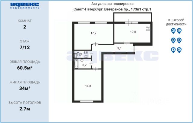 Общая площадь квартиры 46,6 кв.м., жилая (18,8+12,1)кв.м, комнаты изолированы, кухня 8,9 кв.м, санузел совмещен, прихожая 3,6 кв.м.. Окна выходят на пр. Ветеранов, из них виден парк Александрино. В летний и осенний период этот вид завораживает. Вход в парадную со двора, территория дома огорожена, охраняется и находится под видеонаблюдением. В парадных установлен новый домофон, сделан косметический ремонт, везде чистота и порядок. Можно подключиться к камере домофона и с телефона наблюдать территорией