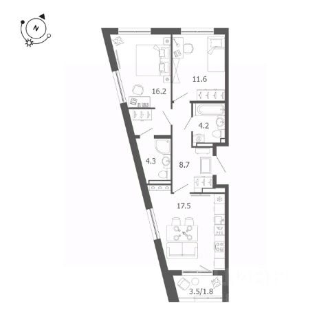 Просторная прихожая 10,2 м, кухня 12,1 м, комнаты 16 м и 15,8 м, санузел раздельный.