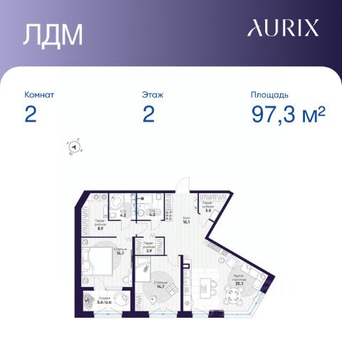 Продается 2-к квартира без отделки в ЖК "ЛДМ". Общая площадь квартиры — 97.3 кв. м, этаж 2 из 8. Тип дома — монолитный. Цена указана при 100% оплате.