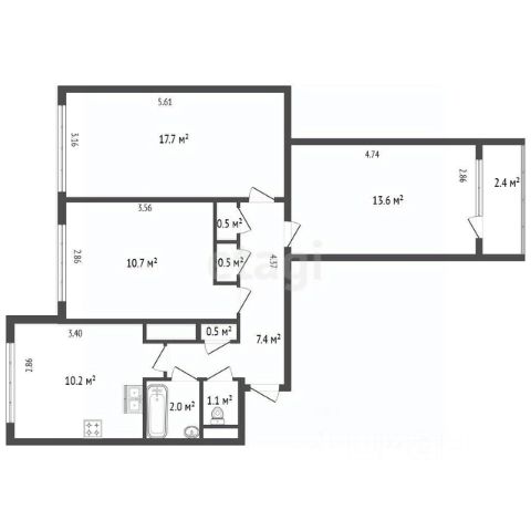 • большая комната около 20 м², которую реально разделить на две — в комнате два окна, что редкость для такого формата