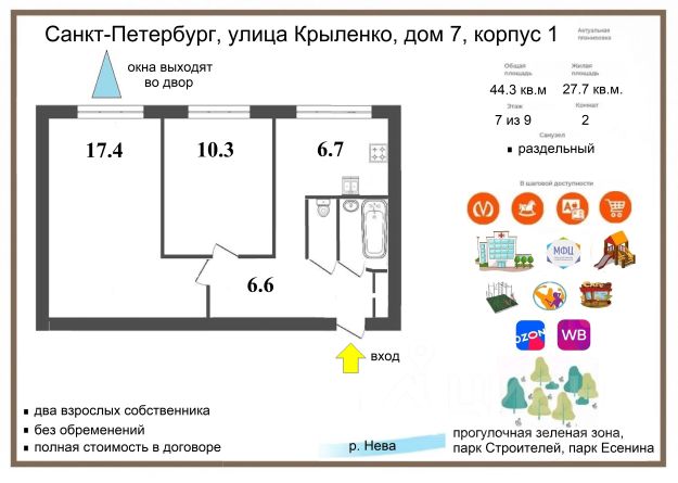 Продаются 2-комнатные апартаменты в сданном доме (Крыленко, 14с3 (Дом 16)), срок сдачи: IV-кв. 2023, общей площадью 52.6 кв.м., на 2 этаже. В стоимость входит полная чистовая отделка. Приобрести апартамент возможно в ипотеку или в рассрочку до окончания строительства (для 2 корпуса). Ипотека предоставляется Сбербанком, ВТБ, Совкомбанком и другими. Жилой комплекс "WINGS" строится на на пересечении оживленного Дальневосточного проспекта и улицы Крыленко. Рядом метро "Улица Дыбенко". Дорога пешком займет примерно двадцать минут. На автобусе или трамвае до метро "Улица Дыбенко" и "Проспект Большевиков" можно доехать за 10 минут. Для автомобилистов рядом находятся Дальневосточный проспект и Октябрьская набережная, по которым возможно быстро добраться до центра города и других районов Петербурга. Выезд на КАД находится в 2 километрах от дома. Первые этажи отданы под коммерческие помещения и службы быта, которыми будут пользоваться жильцы дома. При входе в дом расположится зона ресепшн с портье и охрана. Здание спроектировано с учетом потребностей людей с ограниченными возможностями. Продам 2-комнатную квартиру на улице Крыленко в Санкт-Петербурге.