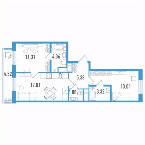 Кухня 17,2 метров. Раздельный санузел. Хорошие комнаты 11,7 м и 13.7 метров .