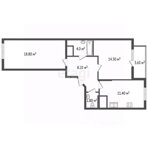 Комнаты: 2 изолированные (гостиная 22 м² + спальня 12 м²)