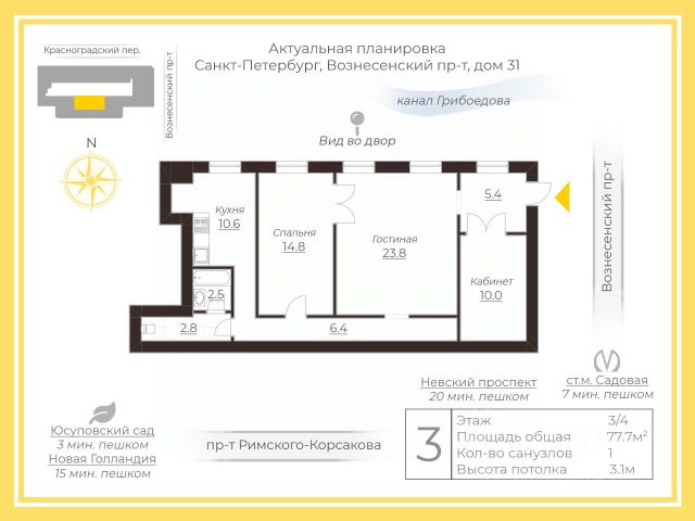 Уникальная квартира с редким преимуществом — двумя независимыми входами из разных парадных. Планировка-трансформер: по документам квартира 2-комнатная, но фактически используется как 3-комнатная. Текущая анфиладная планировка создает единое светлое пространство, но легко трансформируется в классическую с изолированными комнатами. О планировке: общая площадь 77,7 м². Три комнаты: просторная гостиная 24 м², спальня 15 м² и детская/кабинет 10 м². Удобная кухня 8,3 м², большой санузел 5,2 м², внутриквартирный коридор 6,4 м² и прихожая 5,3 м². Высота потолков 3,1 м. В квартире выполнен ремонт, и она полностью готова к проживанию — мебель, которую вы видите на фотографиях, остается новым владельцам. Установлены двойная входная дверь, стеклопакеты, заменены радиаторы отопления, что создает идеальный уют. Квартира расположена на комфортном 3-м этаже 4-этажного дома в самом сердце исторического Петербурга. В парадной всего 4 квартиры, при этом третий этаж полностью в вашем распоряжении. Окна выходят в центр тихого, закрытого и благоустроенного двора, где ведется видеонаблюдение и предусмотрена возможность парковки автомобиля. Прямая продажа. Мы не ищем встречную покупку, поэтому готовы к быстрому заключению договора. Полная стоимость в договоре. Подходит для ипотеки любого банка. Без обременений и долгов. Квартира полностью готова к продаже. Два взрослых собственника (в собственности более 13 лет). Никто не зарегистрирован. Вы получите ключи сразу после сделки. Вы будете жить в окружении главных символов Санкт-Петербурга. Это идеальное место для тех, кто ценит эстетику и хочет каждый день наслаждаться величием города. • В двух шагах: Исаакиевский собор, Юсуповский дворец на Мойке, Мариинский театр, рукой подать - и вы на Дворцовой площади или в Новой Голландии. • Живописные набережные: Прямой выход к набережной канала Грибоедова и близость к реке Мойке — идеальные маршруты для прогулок. • Атмосфера: Это тот самый "Петербург Достоевского", с его неповторимой архитектурой, уютными переулками и знаменитыми мостами, храмами и соборами. Это один из крупнейших транспортных узлов города, что позволяет быстро добраться в любую точку Петербурга. • Метро: В 5-7 минутах ходьбы находится узел из трех станций метро — Сенная площадь, Садовая и Спасская. Это пересечение сразу трех веток метрополитена. • Наземный транспорт: Через Садовую улицу и Вознесенский проспект проходит множество маршрутов общественного транспорта. • Близость к Невскому проспекту: Всего 15-20 минут пешком, и вы на главной артерии города. Несмотря на статус исторического центра, район прекрасно развит для повседневной жизни. Идеальный вариант как для комфортной семейной жизни, так и для выгодных инвестиций. Звоните, с удовольствием отвечу на ваши вопросы и организую показ в удобное для вас время! Продам 2-комнатную квартиру на проспекте Вознесенский в Санкт-Петербурге.