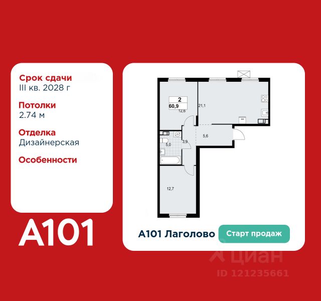Старт продаж! 2-комнатная квартира площадью 46.45 в ЖК "А101 Лаголово" на 13 этаже. Квартира без отделки. Вид из окна на улицу. В квартире 1 санузел. Высота потолков 2.74 м. Предложения от застройщика на декабрь 2025: - Гибкая рассрочка 20 000 руб/мес. и первым взносом 10%. ОТДЕЛКА Квартира передается без отделки. Благодаря тому, что в данном типе отделки стены не возводятся, вы сможете создать удобную планировку и самостоятельно организовать зонирование комнат. ПАРАДНАЯ. В каждой парадной предусмотрены места для хранения велосипедов и колясок, гостевой санузел и удобная зона ожидания для гостей. ДВОРЫ И ОКРУЖЕНИЕ. Просторные дворы безопасны для детей, так как свободны от машин, закрыты от посторонних и постоянно находятся под видеонаблюдением. Во дворах создается разнообразная среда для детей всех возрастов: детские площадки с батутами, тактильными дорожками и игровыми комплексами. Для активного отдыха - воркаут-площадки, столы для пинг-понга и газоны для занятий йогой. Во дворах есть и тихие уголки - зеленые гостиные с уличной мебелью, где можно поработать на свежем воздухе или отдохнуть в тишине. Из внутренних дворов комплекса можно выйти на пешеходный бульвар длиной около 900 метров. Здесь будет организовано полноценное общественное пространство с амфитеатром, уличным кафе, ручьем, фонтаном и множеством мест для отдыха и игр. Большую часть бульвара займут благоустроенные зеленые зоны и теневые сады из десятков видов деревьев и кустарников, многолетних цветов и трав, которые будут радовать глаз круглый год. "А101 Лаголово" - современный город у подножия знаменитых Дудерговских высот, в объятиях чистейших озер и зеленых живописных массивов, наполненный всем необходимым для счастливой жизни. ИНФРАСТРУКТУРА. Мы занимаемся комплексным освоением территории. Наш приоритет - доступность всех сервисов для счастливой жизни. 1. Лаголово-город 15-ти минутной доступности. Вся необходимая инфраструктура: магазины, салоны красоты, образовательные учреждения, медицинские центры находятся в 15-ти минутах пешей прогулки от любой точки жилого комплекса. Это позволяет не тратить время на долгие перемещения. 2. Представьте идеальный город, где ребенок может спокойно играть, а пожилой человек наслаждаться заслуженным отдыхом. Жилая среда нашего комплекса может комфортно использоваться как 8-летним ребенком, так и 80-летним пожилым человеком. Дома, улицы, общественные пространства, тротуары спроектированы с заботой о людях разных возрастов. 3. Мы активно развиваем авторскую образовательную экосистему "Лёрнити". Она включает строительство 8 современных детских садов (2000 мест) и 3 школ (2945 учащихся). Мы учим родителей гармонично общаться с детьми, помогаем малышам подготовиться к школе, а подросткам - выбрать будущую профессию и развить таланты. Не хватает средств на покупку кладового помещения? Оформите ипотеку на квартиру и добавьте к ней часть стоимости кладовой. ЗАСТРОЙЩИК ГК "А101" - крупный инвестиционно-строительный холдинг, занимает 6-е мест