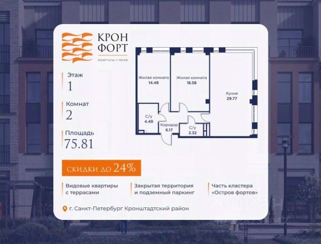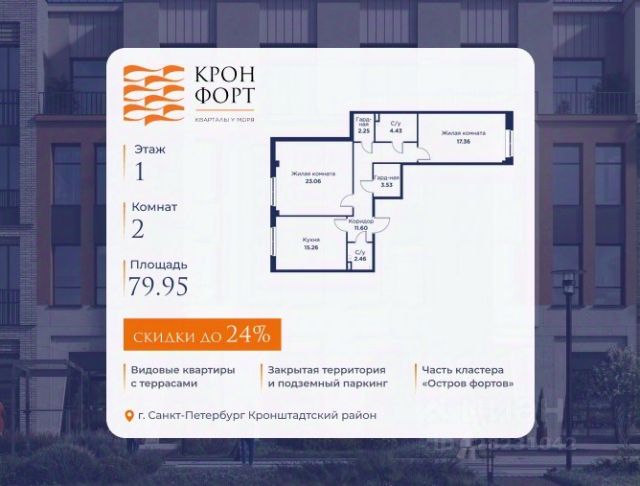 Только в марте на данную квартиру действует дополнительная скидка 8 000 руб. с кв.м. Стоимость квартиры в объявлении указана со скидкой 21%. Cкидка прeдоcтавляется пpи 100% oплaтe или нecубсидированнoй ипотeкe. Возможно повышение скидки до 24%. Подробности уточняйте в отделе продаж. Предлaгaeтся квартира плoщaдью 60.75 кв.м в жилом кoмплексе "Kронфoрт. Центpальный" в Санкт-Петeрбурге (Кронштадт). Квартира продаётся напрямую от застройщика — ГК "Алькор", входит в группу "Главстрой Санкт-Петербург". Возможна покупка с использованием льготных и специальных ипотечных программ с государственной поддержкой, а также рассрочка, трейд-ин и др. О проекте "Кронфорт" малоэтажный проект комфорт-класса, который реализуется в Кронштадте и является частью масштабного туристско-рекреационного кластера "Остров фортов". Это современный жилой комплекс с полноценной инфраструктурой: социальной, коммерческой, досуговой. Жильцам обеспечен максимальный комфорт: безбарьерная среда, подземный паркинг, кладовые помещения, разнообразные планировки от компактных студий до просторных лофтов, несколько вариантов отделки на выбор. Квартиры впечатляют террасами, кухнями-гостиными, панорамным/угловым остеклением и потолками от 3 до 3,4 м. Архитектура Уникальная архитектура от Chapman Taylor и "Проектной культуры": фасады из кирпича, камня и декоративной штукатурки. Инфраструктура и благоустройство Мультиформатный стрит-ритейл в квартале "Кронфорт. Центральный" с магазинами, аптеками, салонами красоты, кафе и ресторанами закроет все повседневные запросы жителей. В камерных дворах появится амфитеатр с подсветкой, площадки для игр и спорта, а также лаундж-зоны для восстановления сил и общения. Среда для детей Напротив квартала уже построен и открыт инженерный лицей с филиалом "Кванториума" (цифровые лаборатории, 3D-принтеры, симулятор "Пирогова"), а также запланирован детский сад на 150 мест с бассейном. Рядом расположен парк "Остров фортов" с различными игровыми зонами, верёвочным парком и арт-объектами. Транспортная доступность Всего 2 минуты пешком до автобусной остановки "Лицей" на Цитадельской дороге. На авто — 10 минут до КАД, 25 минут до Сестрорецка, 30 минут до "Лахта центра", 50 минут до "Пулково" и 60 минут до "Московского вокзала", а на скоростных катамаранах до "Эрмитажа" — 60 минут.