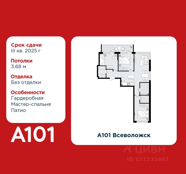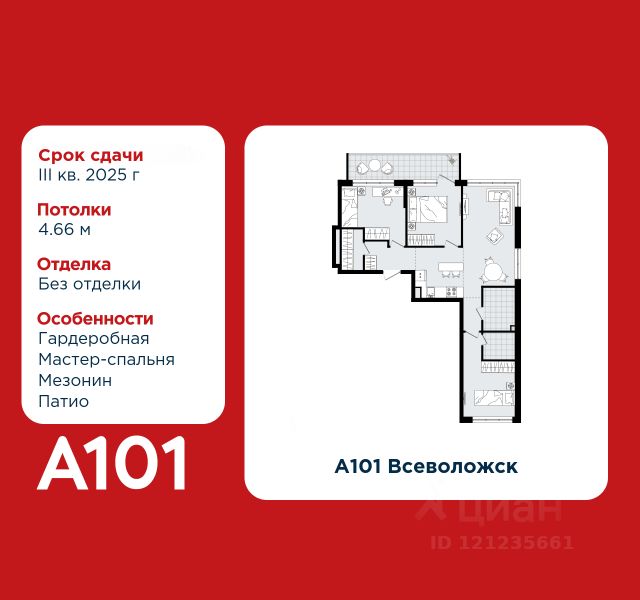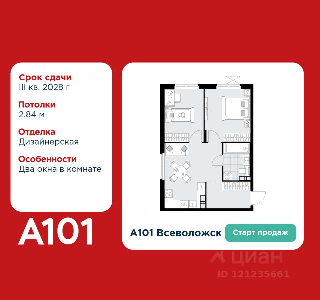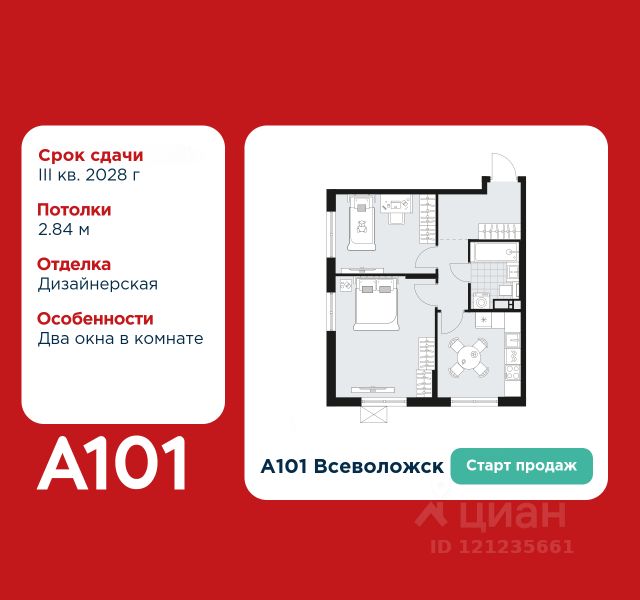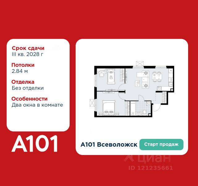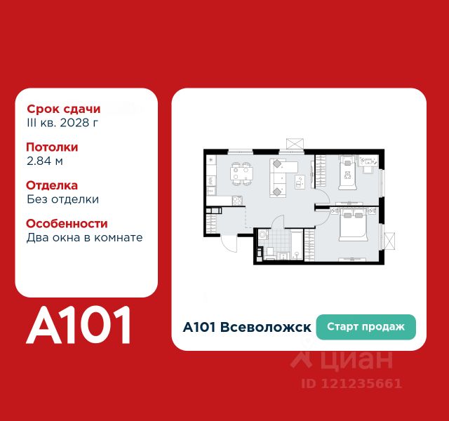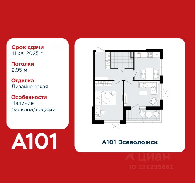 Видовая 2-комнатная квартира площадью 45.90 в ЖК "А101 Всеволожск" c лоджией на 6 этаже. Квартира white box. Вид из окна во двор. В квартире 1 санузел. Высота потолков 2.8 м. Предложения от застройщика на январь 2026: - Гибкая рассрочка 20 000 руб/мес. и первым взносом 10%. ОТДЕЛКА Квартира с предчистовой отделкой предполагает: качественную стяжку на полах под финишное покрытие, потолок с обеспыливающей грунтовкой белого цвета, ровные стены с покрытием штукатурка. Выполнены все работы по проведению электрики. На все отделочные работы от застройщика предоставляется гарантия. Если вы хотите дозаказать дизайнерскую отделку, обращайтесь к нашими специалистами. ОСОБЕННОСТИ ПЛАНИРОВКИ Глубокая лоджия от 1,4м позволяет организовать отдельный кабинет, мастерскую или зимний сад с лаундж-зоной. ПАРАДНАЯ В каждой парадной предусмотрены места для хранения велосипедов и колясок, гостевой санузел, лапамойка (место для мытья домашних животных или колес велосипедов) и удобная зона ожидания для гостей. ДВОРЫ И ОКРУЖЕНИЕ Просторные дворы свободны от машин и закрыты от посторонних. Большую часть комплекса займут благоустроенные зелёные зоны, теневые сады и городские общественные пространства с развитой тротуарной сетью и велодорожками. Каждый дом оборудован системами видеонаблюдения и контроля доступа. "А101 Лаголово" - современный город у подножия знаменитых Дудерговских высот, в объятиях чистейших озёр и зелёных живописных массивов, наполненный всем необходимым для счастливой жизни. Не хватает средств на покупку кладового помещения? Оформите ипотеку на квартиру и добавьте к ней часть стоимости кладовой. ЗАСТРОЙЩИК ГК "А101" - крупный инвестиционно-строительный холдинг, занимает 6-е место по объему строительства в России (по данным "Единого ресурса застройщиков" на 2023 год). НКР присвоило ГК "А101" кредитный рейтинг A+.ru, подтверждая его надежность и финансовую устойчивость для завершения строительства ЖК.