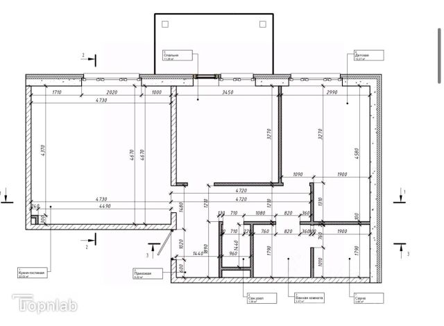 При желании гостиную-кухню можно разделить на раздельные помещения, на плане обозначены площади.